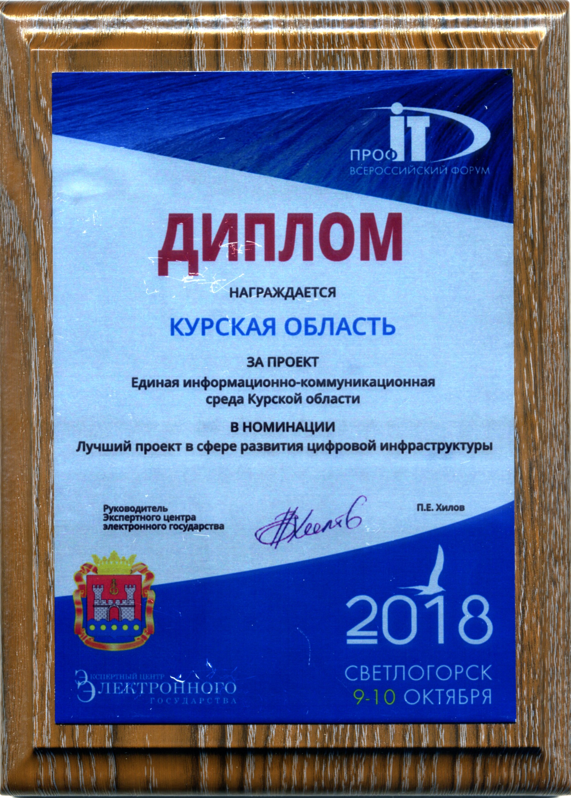 «Проект «Единая информационно-коммуникационная среда Курской области» награжден Дипломом конкурса «ПРОФ-IT.2018» в номинации «Лучший проект в сфере развития цифровой инфраструктуры».